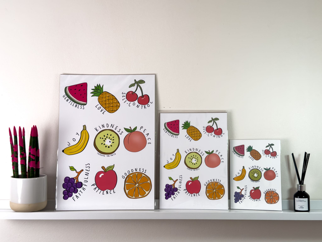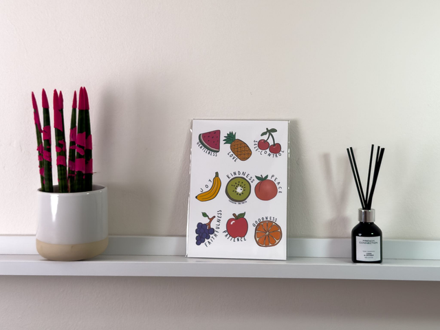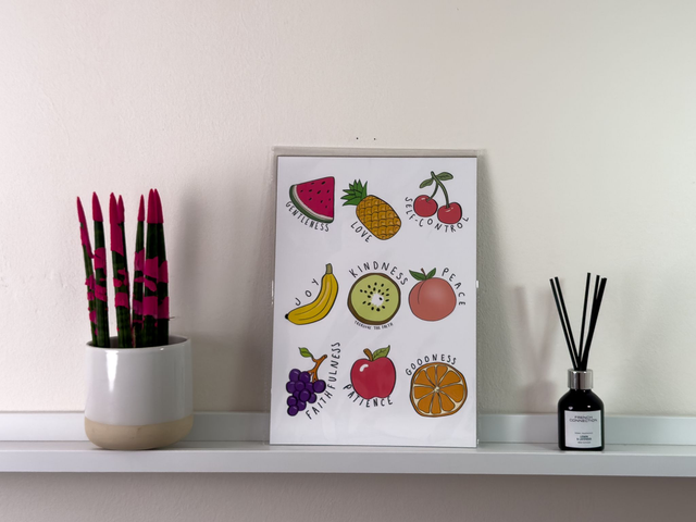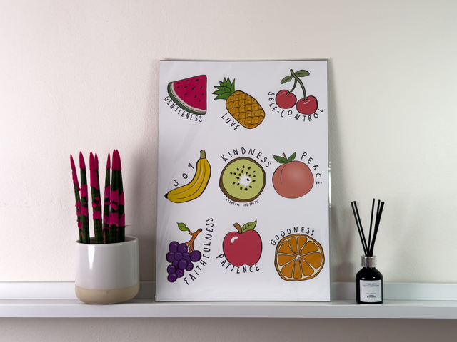 This vibrant and inspirational A4 print features a playful yet meaningful design, incorporating colorful fruit illustrations alongside virtues that encourage personal growth. Each fruit represents fruit of the spirit, from gentleness and love to faithfulness and goodness, offering a reminder to embody these qualities every day. Ideal for any space, this charming piece adds both aesthetic appeal and motivational value to your home or office decor. It's perfect for those seeking to foster positivity, kindness, and peace in their daily lives.