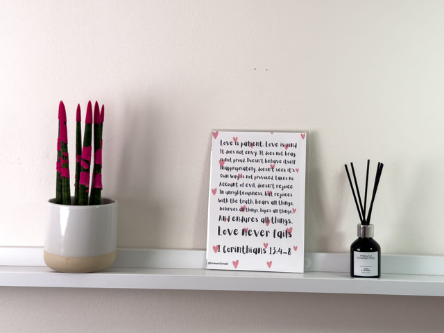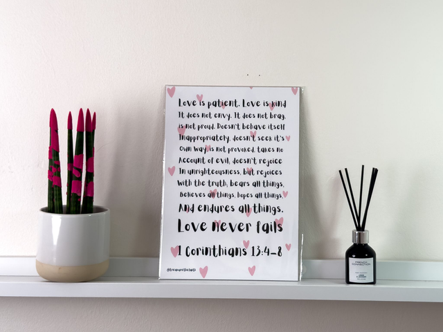 Bring a touch of faith and inspiration to your space with this beautifully designed print featuring one of the most beloved Bible passages: 1 Corinthians 13:4–8. Adorned with soft pink hearts and playful, modern typography, this print highlights the enduring qualities of true love—patience, kindness, truth, and perseverance. Perfect for gifting, weddings, home décor, or as a gentle daily reminder of God’s love, this piece makes a heartfelt addition to any room.