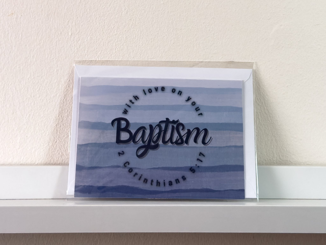 Celebrate the joyous occasion of baptism with this beautifully designed card featuring a serene blue hand-drawn background that symbolizes purity and renewal. The front of the card has the verse 2 Corinthians 5:17 on the front